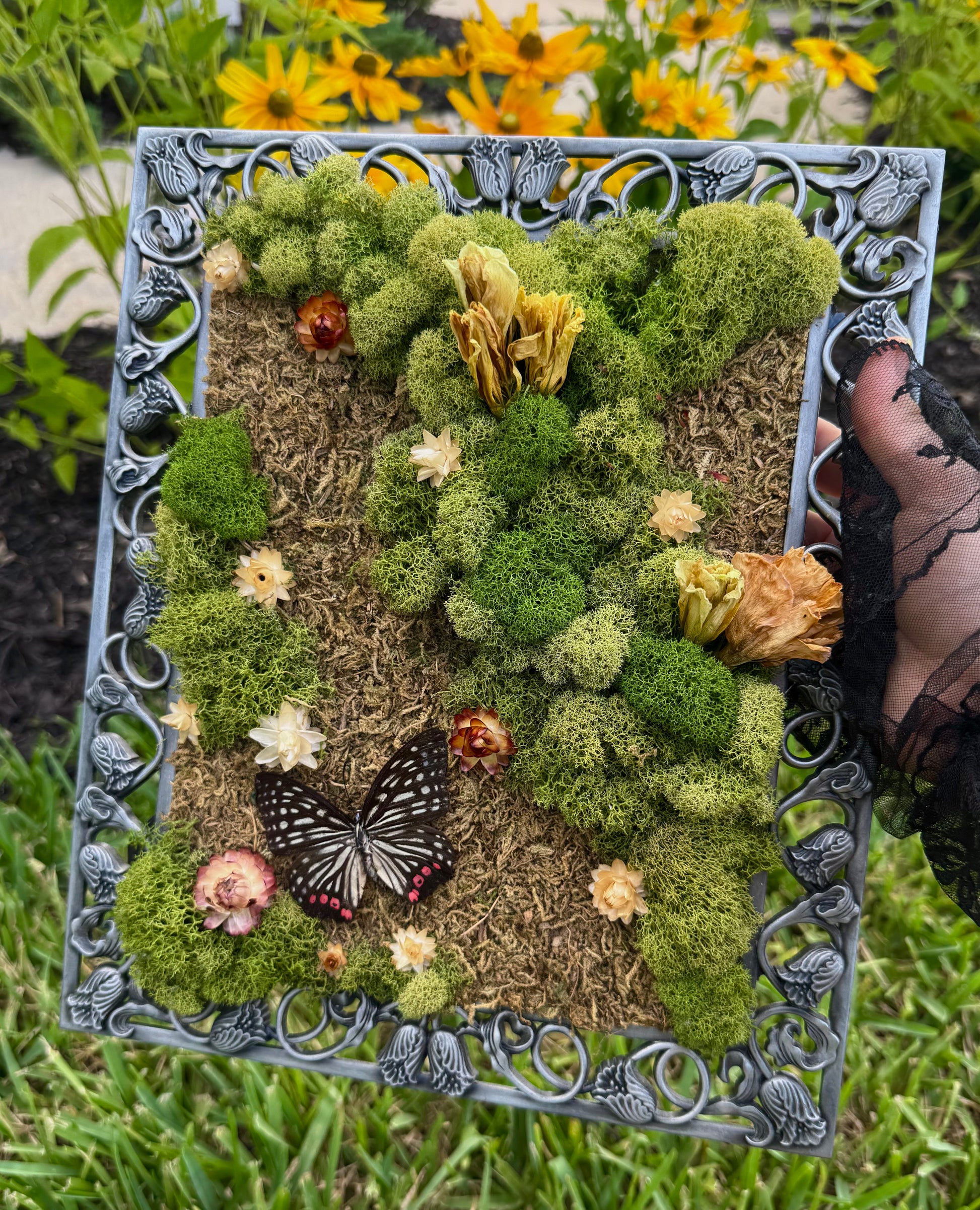 Preserved moss art with dried florals and a real pinned butterfly