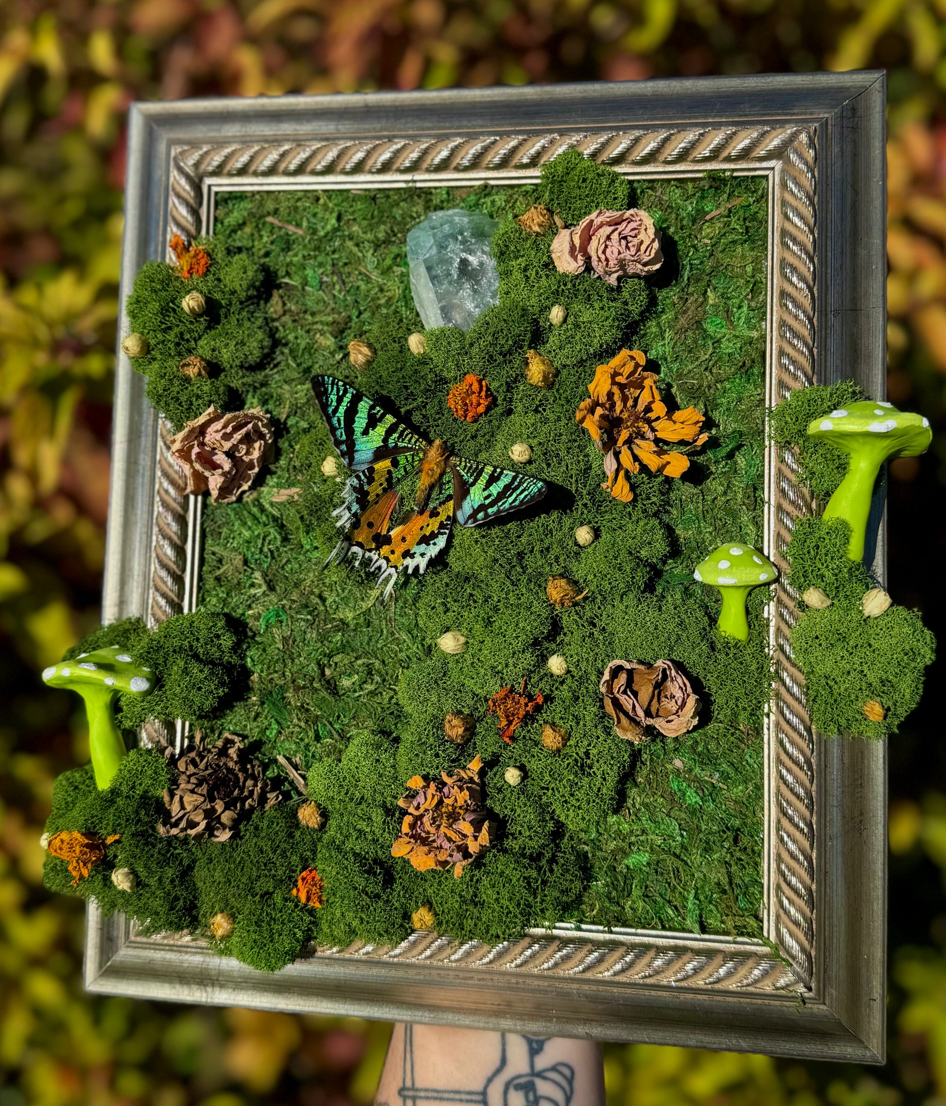 Preserved moss art with a real pinned sunset moth**, dried florals, blue flourite, and polymer sculpted mushrooms