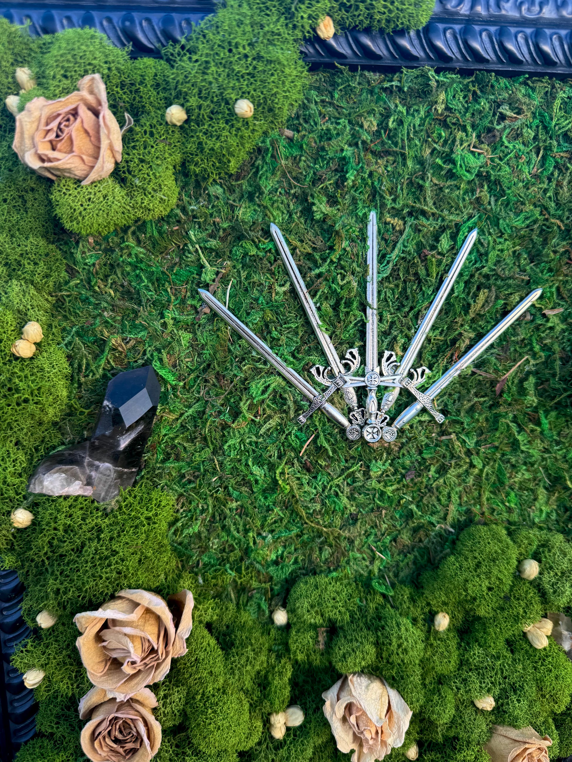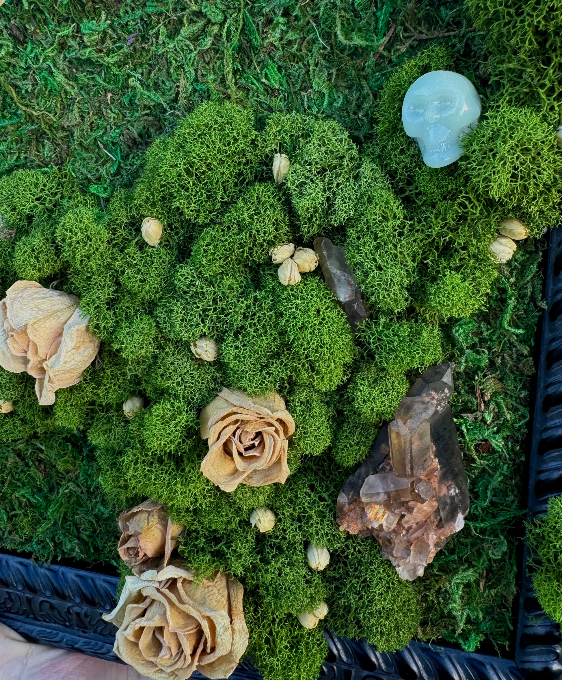 Preserved moss art with dried florals, two chunky pieces of smoky quartz, a glow in the dark resin skull and tiny model swords